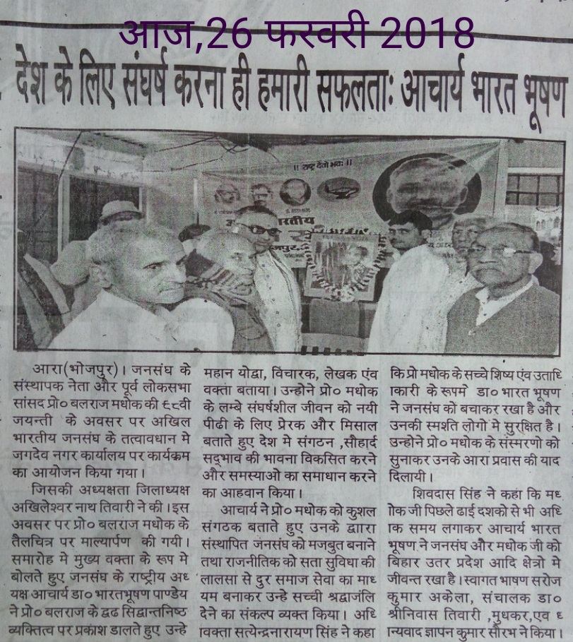 प्रो.बलराज मधोक जी की जयन्ती के समाचार —आज के पत्रों में News clips of birth anniversary celebration of AkhilBharatiya Jansangh Jansangh Bihar-Pradesh leader Prof.Balraj Madhok in today’s newspapers. Bharat Bhushan Pandey